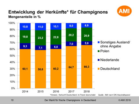 2018 wurden in Deutschland 79.150 t Speisepilze angebaut. Davon entfielen 76.000 t auf Champignons. 69.000 t dieser Produktion sind für den Frischmarkt, das ist ein neuer Rekord. 3.150 t entfielen auf die anderen Arten, die sogenannten „Edelpilze“. Über 95 Prozent der hier zu Lande produzierten Pilze sind Champignons. Immer beliebter werden die braunen Champignons. Sie gewinnen weitere Marktanteile. Betrachtet man die letzten vier Jahre, so ist deren Anteil von gut 16.000 t auf über 26.000 t gestiegen. Bei den weißen Champignons gibt es kaum Veränderungen. Das hat die Agrarmarkt Informations-Gesellschaft mbH (AMI) für den Bund Deutscher Champignon- und Kulturpilzanbauer (BDC) ermittelt.